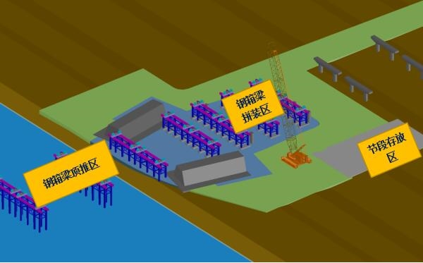 為避免河道水資源污染,確保航道通暢,箱梁采用整節(jié)段拼裝、頂推施工工藝。主橋鋼結構現(xiàn)場施工分為鋼箱梁頂推和拱肋吊裝兩部分,鋼箱梁塊段運輸至現(xiàn)場的拼裝支架上組拼成大塊段節(jié)段,焊接完成整體后進行頂推施工(鋼箱梁頂推施工期間, 18#、21#墩引橋側高蓋梁暫不施工,主橋側支座墊石正常施工),依次循環(huán),直至鋼箱梁全部頂推完成。拱肋放置于鋼箱梁對應位置一同頂推到位,鋼箱梁整體落梁至頂推臨時支架上,2臺400t履帶吊上橋進行拱肋支架安裝和拱肋安裝。過程中通過整體頂推設備控制程序自動調(diào)節(jié),確保設備的協(xié)調(diào)同步。