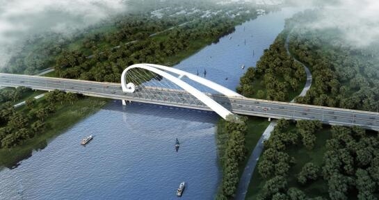 香河縣安石路(運河大道-冀京界段)建設工程是《北京市通州區(qū)與河北省三河、大廠、香河三縣市協(xié)同發(fā)展規(guī)劃》的重點工程,也是北運河廊坊段旅游通航的重要組成部分路線全長3.624公里,采用一級公路兼城市主干路標準建設,道路標準橫斷面采用四幅路形式,雙向六條機動車道,外設非機動車道和人行道,路基寬47米。其中橋梁段(即王家擺大橋)1060.1米(主橋長256米,引橋長804.1米)采用抱翅型拱梁組合體系,由“Λ”字抱翅外形的空間異形主拱拱圈、拱圈內(nèi)與主梁連接的斜吊桿和主梁三大主體結構組合而成,主梁半幅為整體鋼箱,半幅之間用橫梁連接,拉索錨固在抱翅拱和主梁的橫梁上,橋面板采用正交異性鋼橋面板。抱翅拱的一端在中央隔離帶處與主梁橫梁連接,下接中墩支座;抱翅拱的另一端成“Λ”形分布于主梁兩側,通過橫梁與主梁連接。造型創(chuàng)意以如意型浪花為構思元素,將運河之水奔流涌動之態(tài)和如意的古典華美抽象融合,建成后將成為當?shù)匾蛔鶚O富美感的景觀橋。