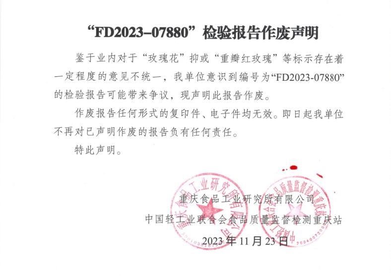 鑒于業內對于“玫瑰花”抑或“重瓣紅玫瑰”等標示存在著一定程度的意見不統一,我單位意識到編號為“FD2023-07880”的檢驗報告可能帶來爭議,現聲明此報告作廢。
