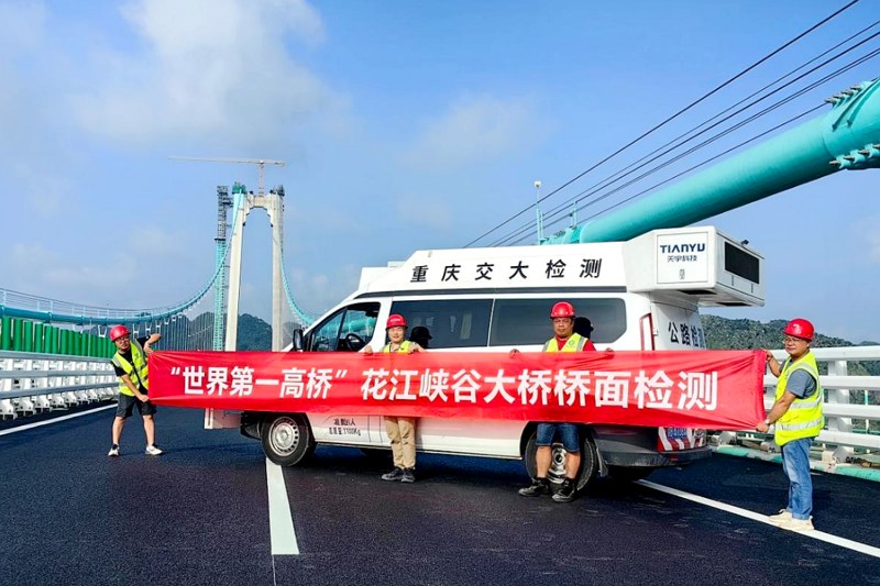 在此次挑戰世界之巔的檢測任務中,市建科院所屬重慶交大建設工程質量檢測中心有限公司檢測團隊將“檢測公正、服務及時、方法科學、誠實守信、遵規守紀”的質量方針貫穿于項目全生命周期,為大橋橋面檢測任務量身定制了科學周密、前瞻精準的技術方案。在項目實施過程中,檢測團隊憑借深厚的技術實力攻克了因橋面超高、跨度極大帶來的系列“高精尖”檢測難題。他們對每一次檢測質量嚴格把關,讓檢測數據精準、及時、科學地呈現在檢測報告上,確保了所有檢測指標均符合大橋設定與行業規范。